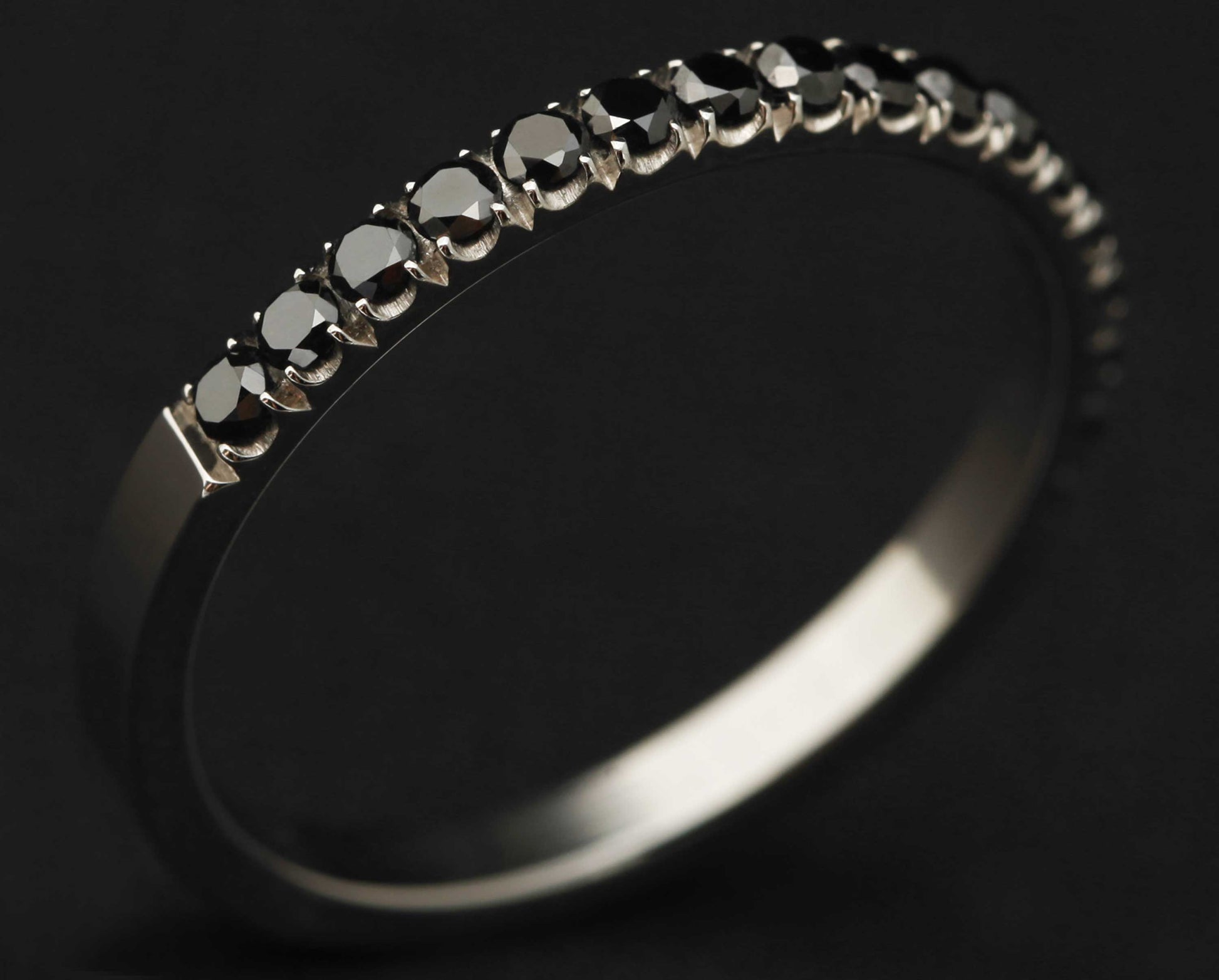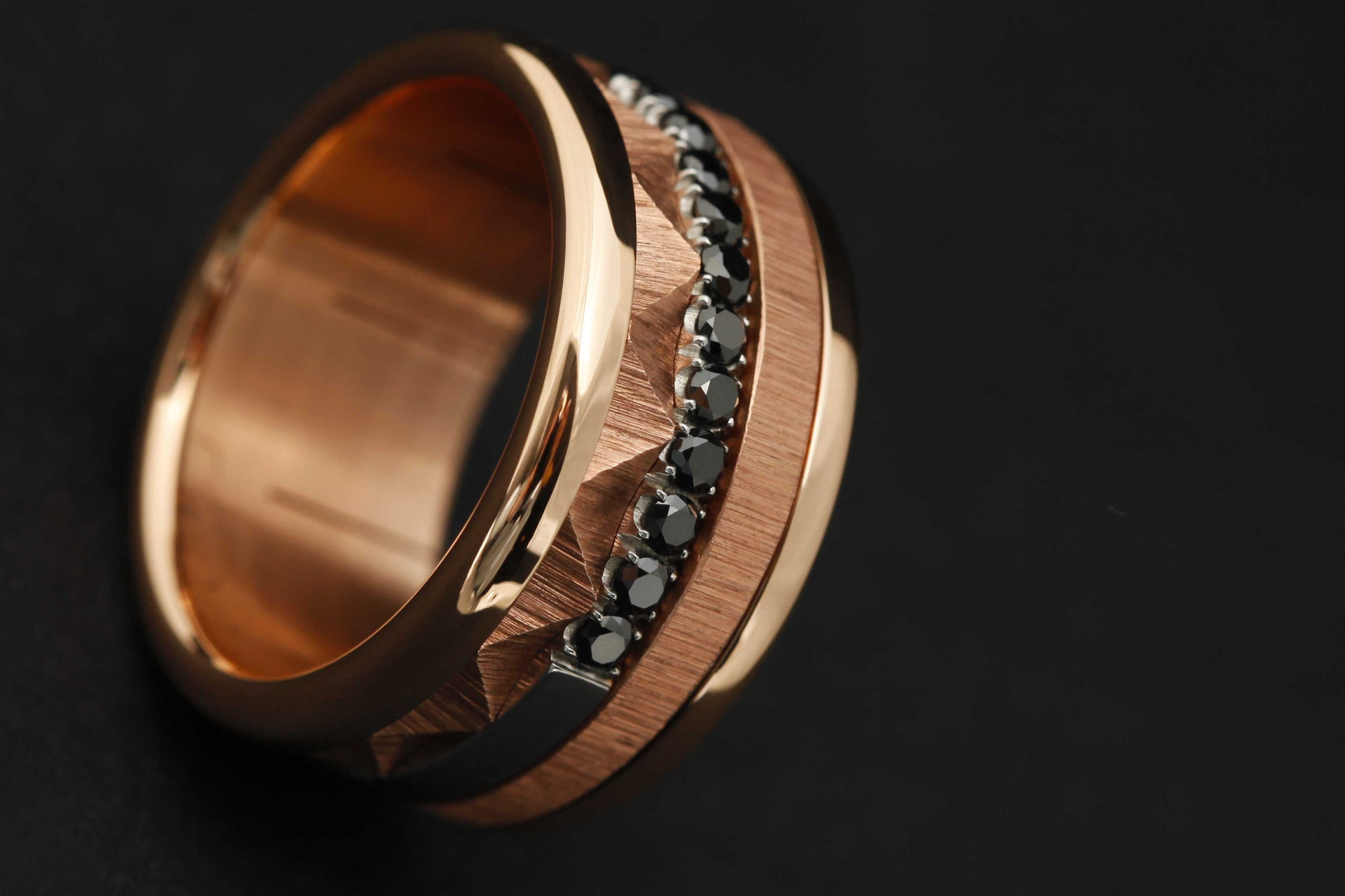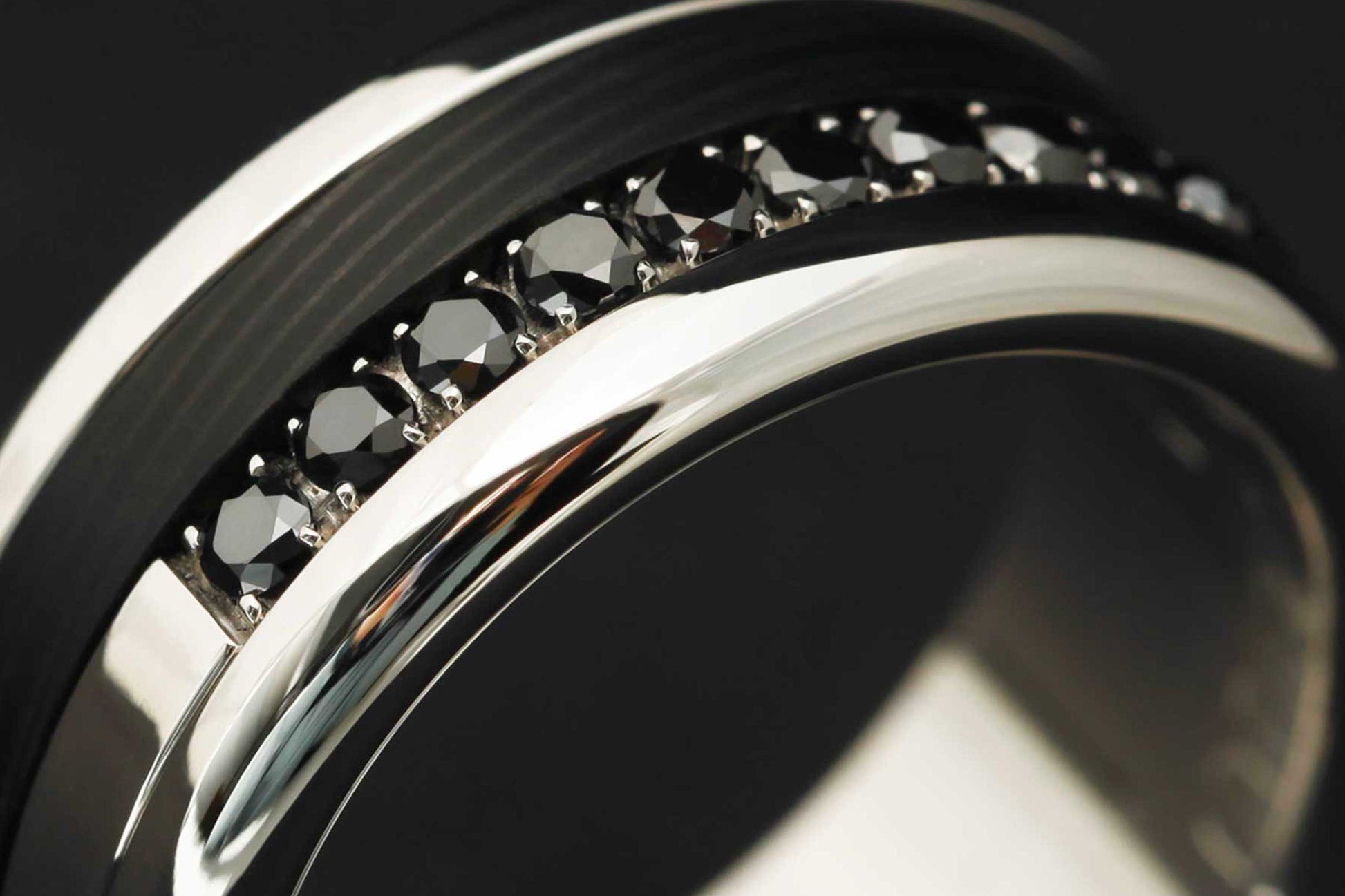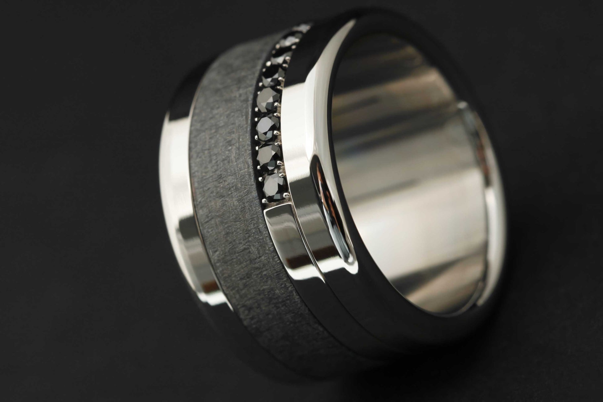 Ce medium est serti à moitié de diamants noirs 1.9mm. Le nombre de pierres variera selon la taille. Le medium est fait à partir d'acier. De ce fait, sur la moitié où les pierres ne sont pas serties, de l'acier poli sera visible.