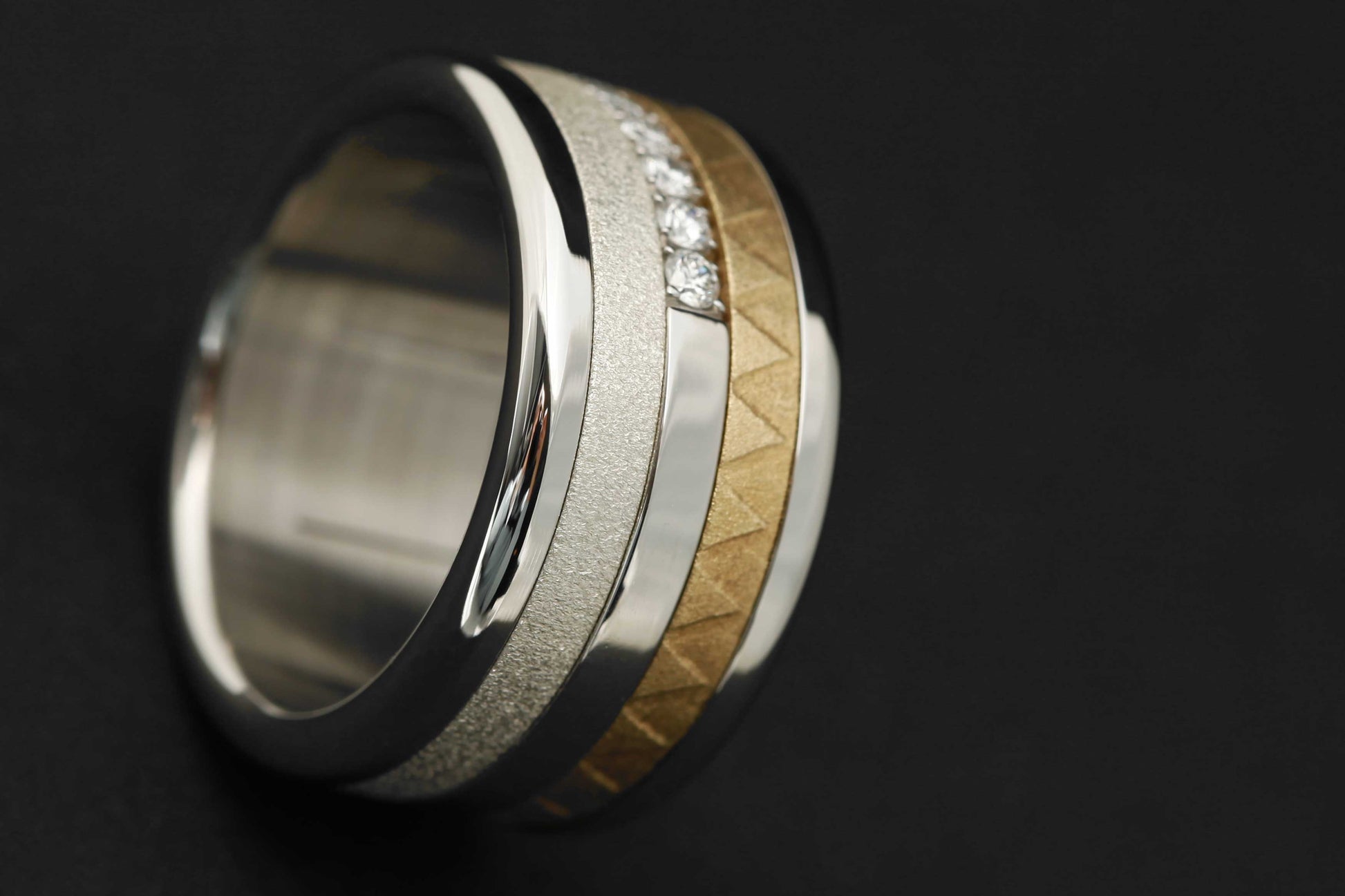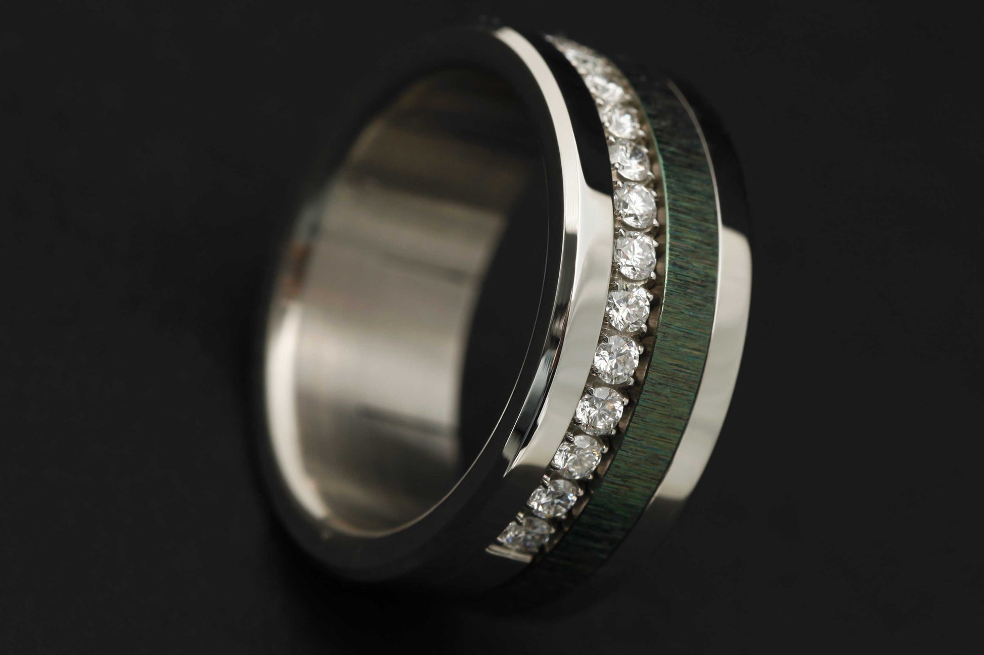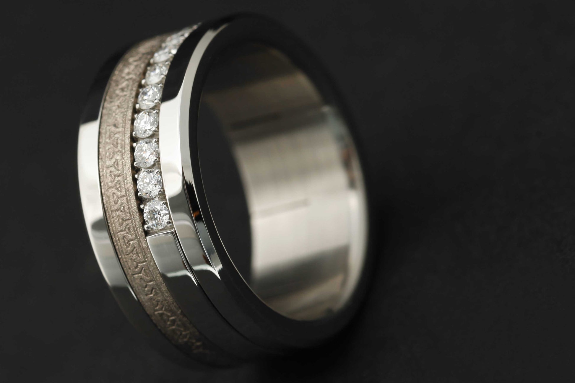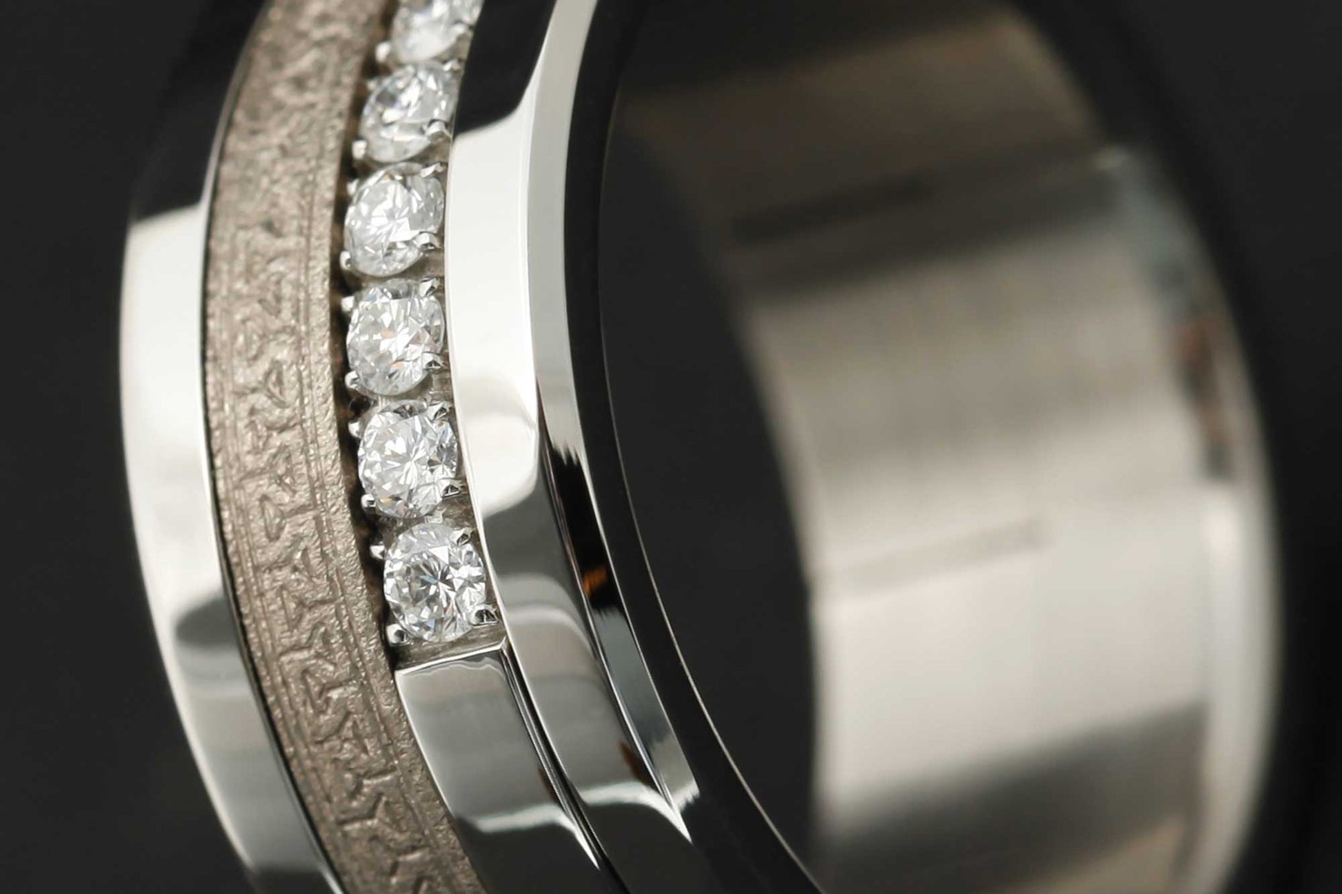 Ce medium est serti à moitié de diamants 1.9mm. Le nombre de pierres variera selon la taille. Le medium est fait à partir d'acier. De ce fait, sur la moitié où les pierres ne sont pas serties, de l'acier poli sera visible.