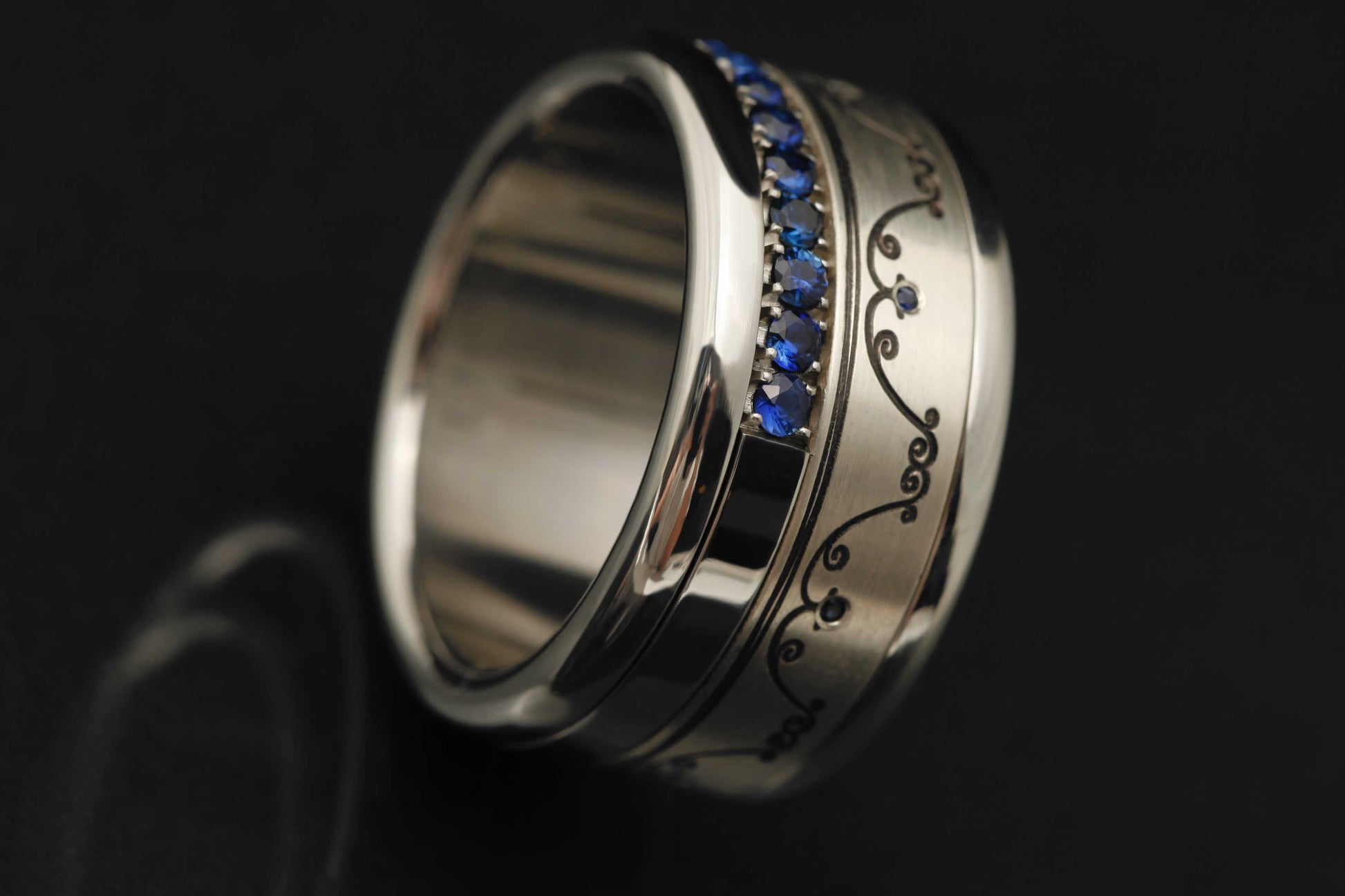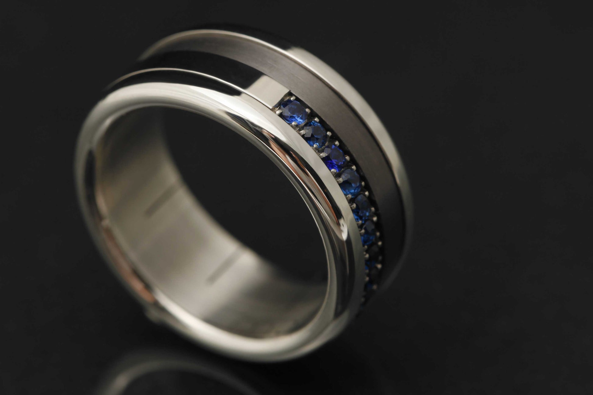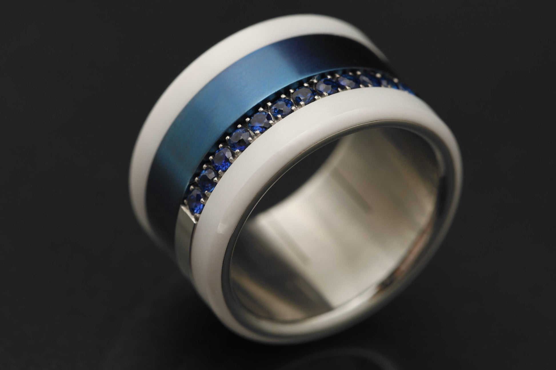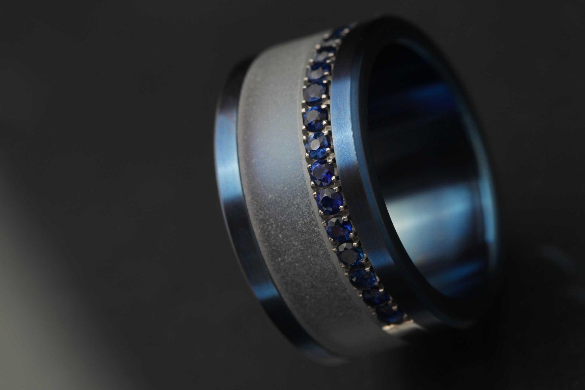 Ce medium est serti à moitié de saphirs bleus 1.9mm. Le nombre de pierres variera selon la taille. Le medium est fait à partir d'acier. De ce fait, sur la moitié où les pierres ne sont pas serties, de l'acier poli sera visible.