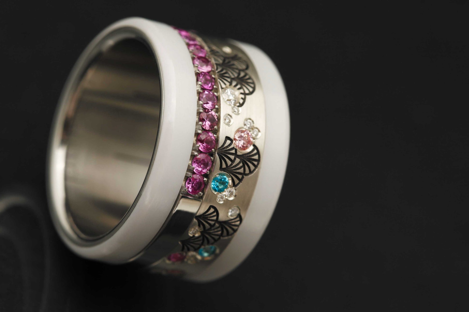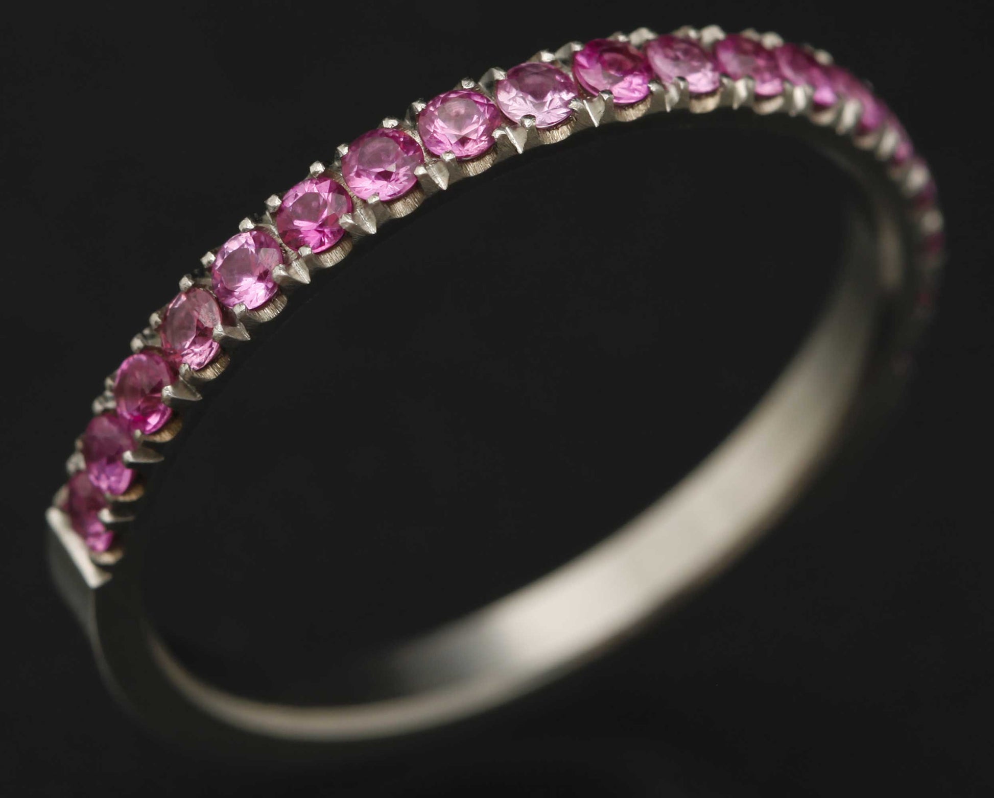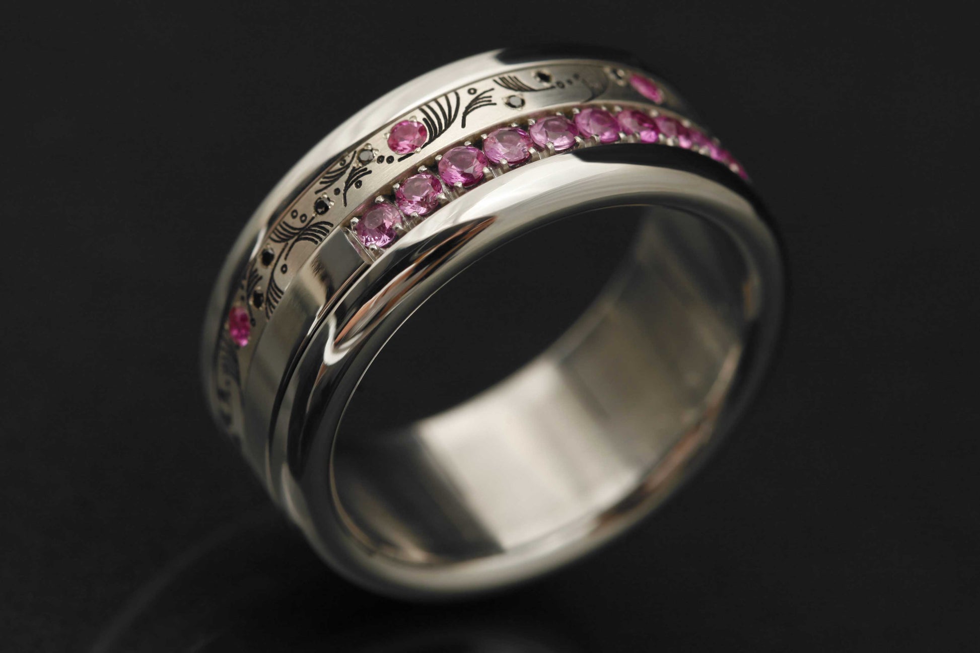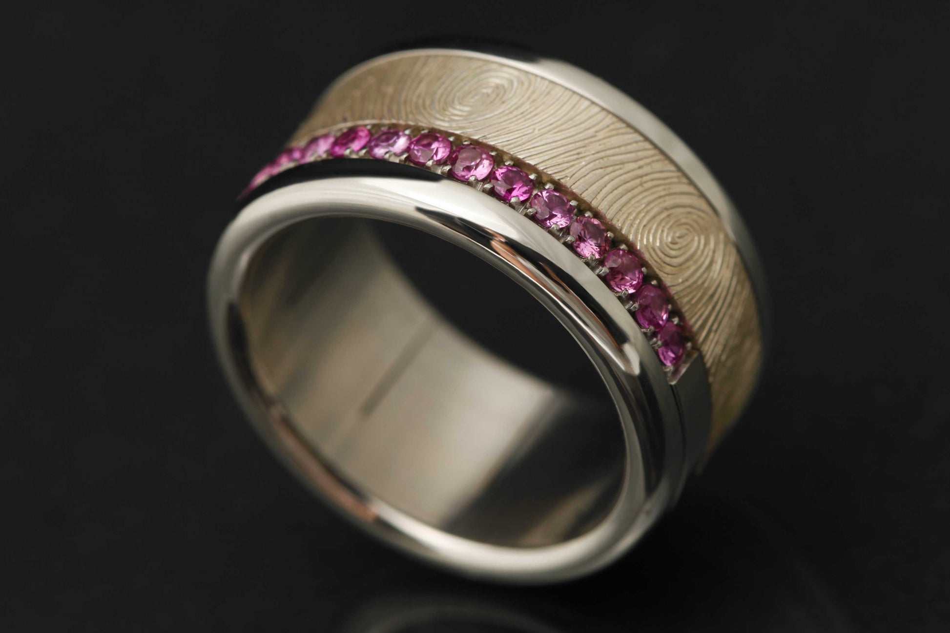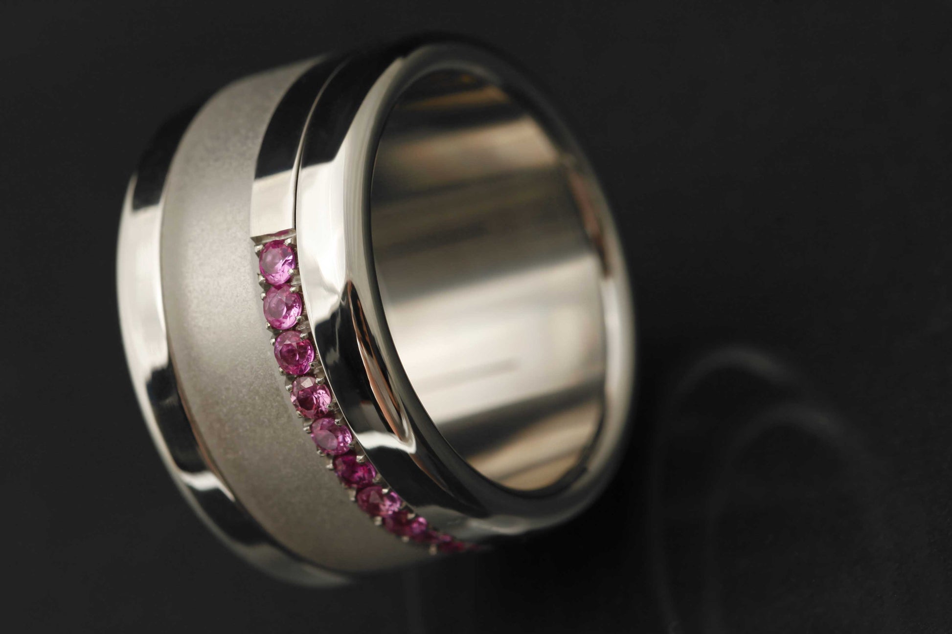Ce medium est serti à moitié de saphirs roses 1.9mm. Le nombre de pierres variera selon la taille. Le medium est fait à partir d'acier. De ce fait, sur la moitié où les pierres ne sont pas serties, de l'acier poli sera visible.
