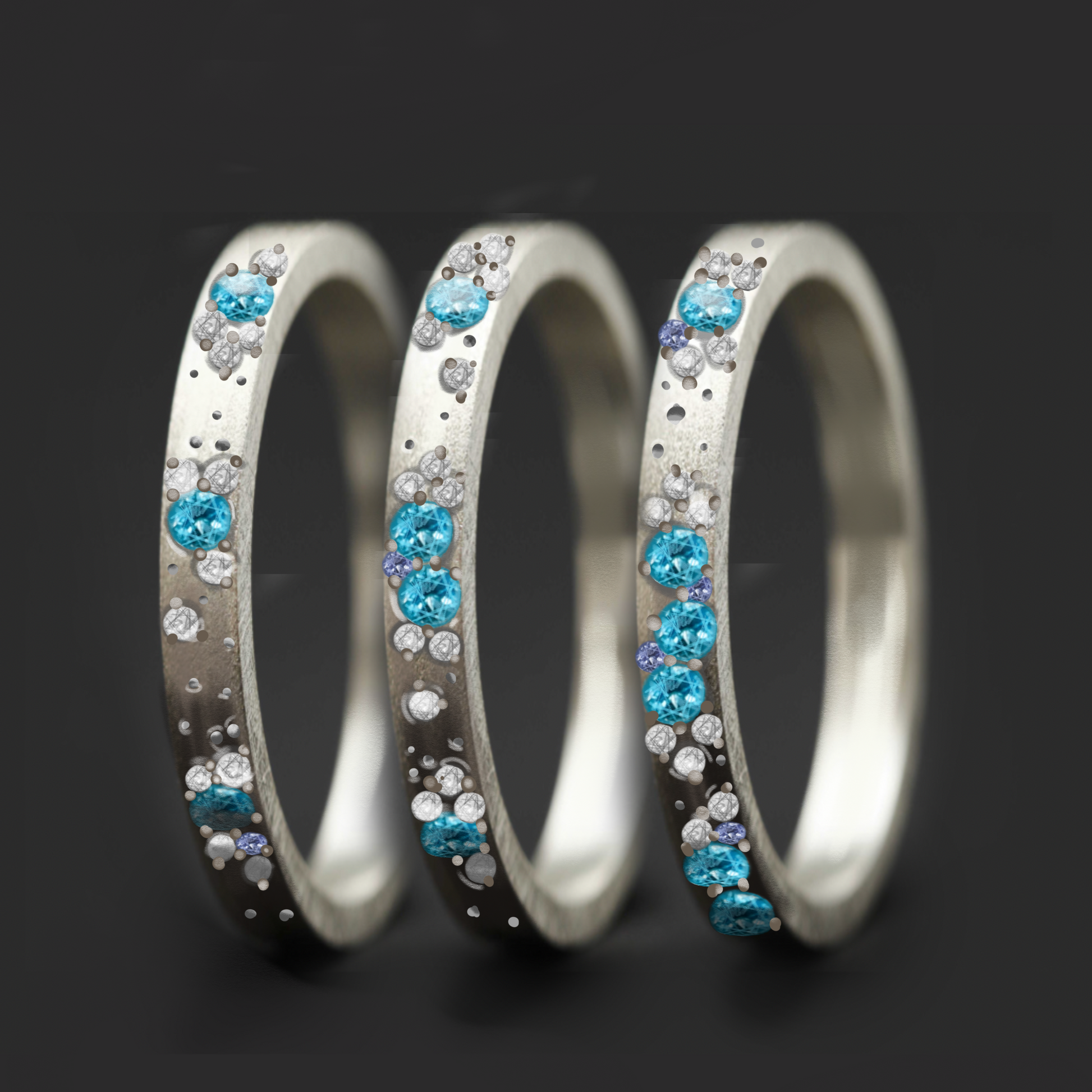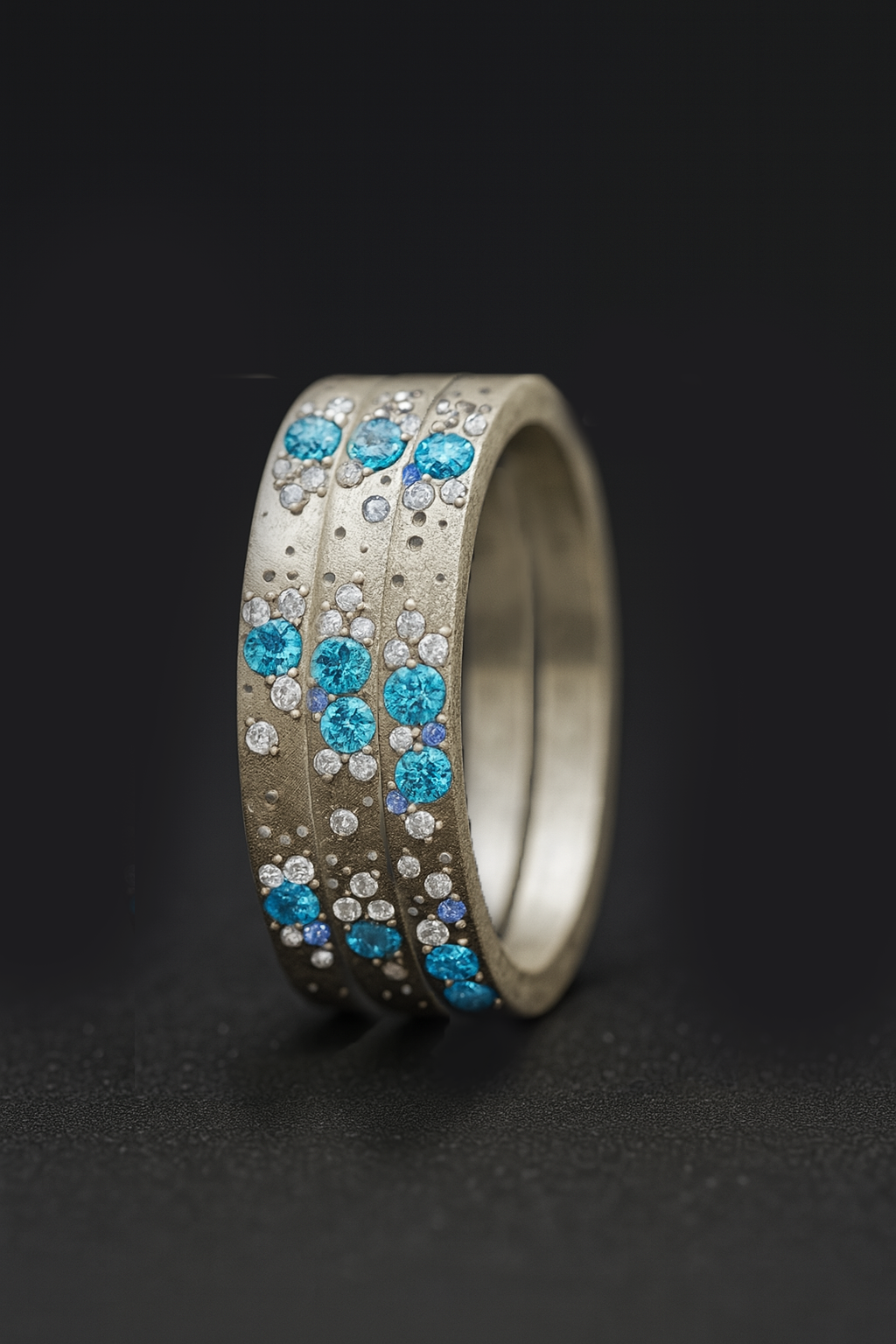 Anneau en argent sablé (3 mediums) Oygene avec topazes, diamants et saphirs bleus clairs pour bague mood de luxe