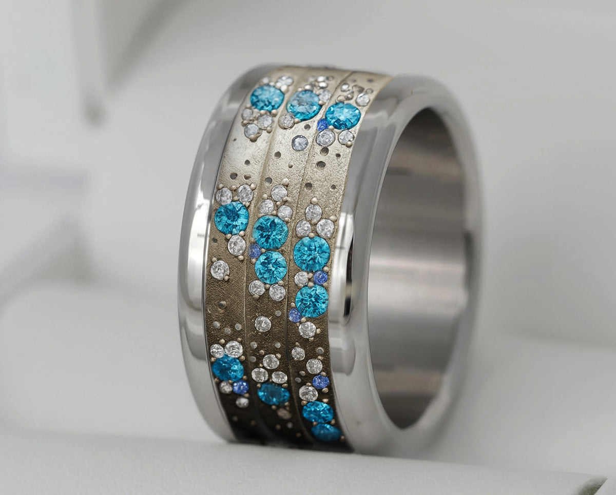 Ensemble, ces Mediums forment un motif abstrait, mouvant et aérien. Les pierres captent la lumière, se répondent, s’opposent ou s’unissent, créant une bague vivante, changeante — à l’image de l’été.