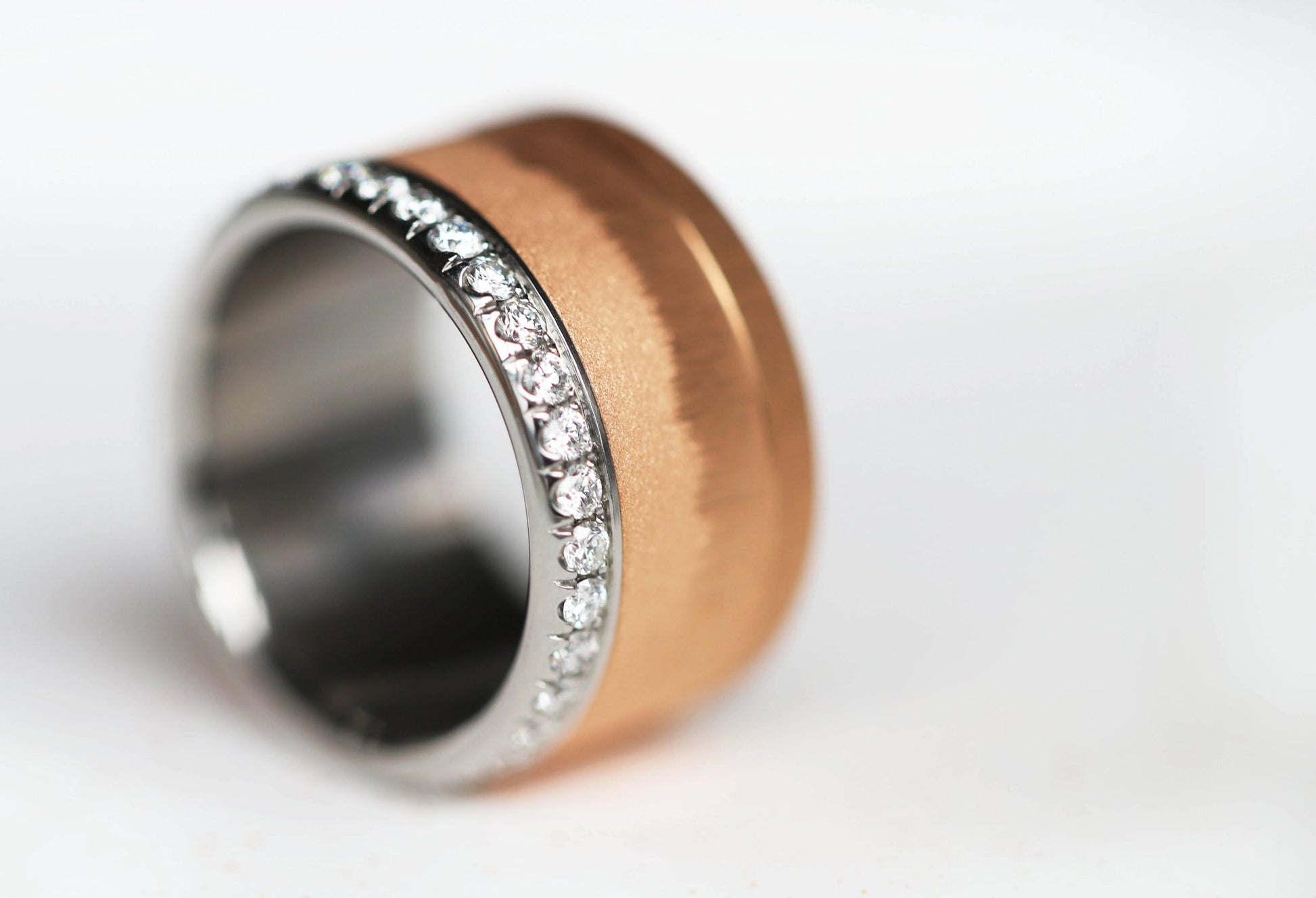 Ce coffret comprend une base large froissée rose gold (13mm), une base large arrondie polie (13 mm) entièrement serti d'un coté de diamants 1.6mm, un addon en acier "Cristal de givre" rose gold.