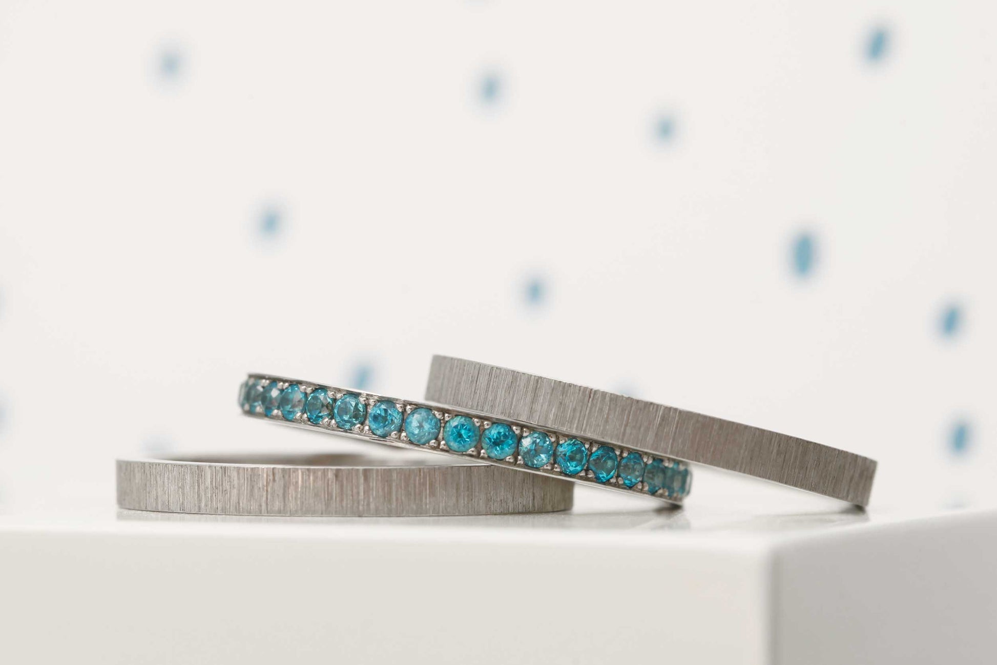 Ce coffret d'hiver comprend deux medium en acier froissé et un medium acier entièrement serti de topazes.