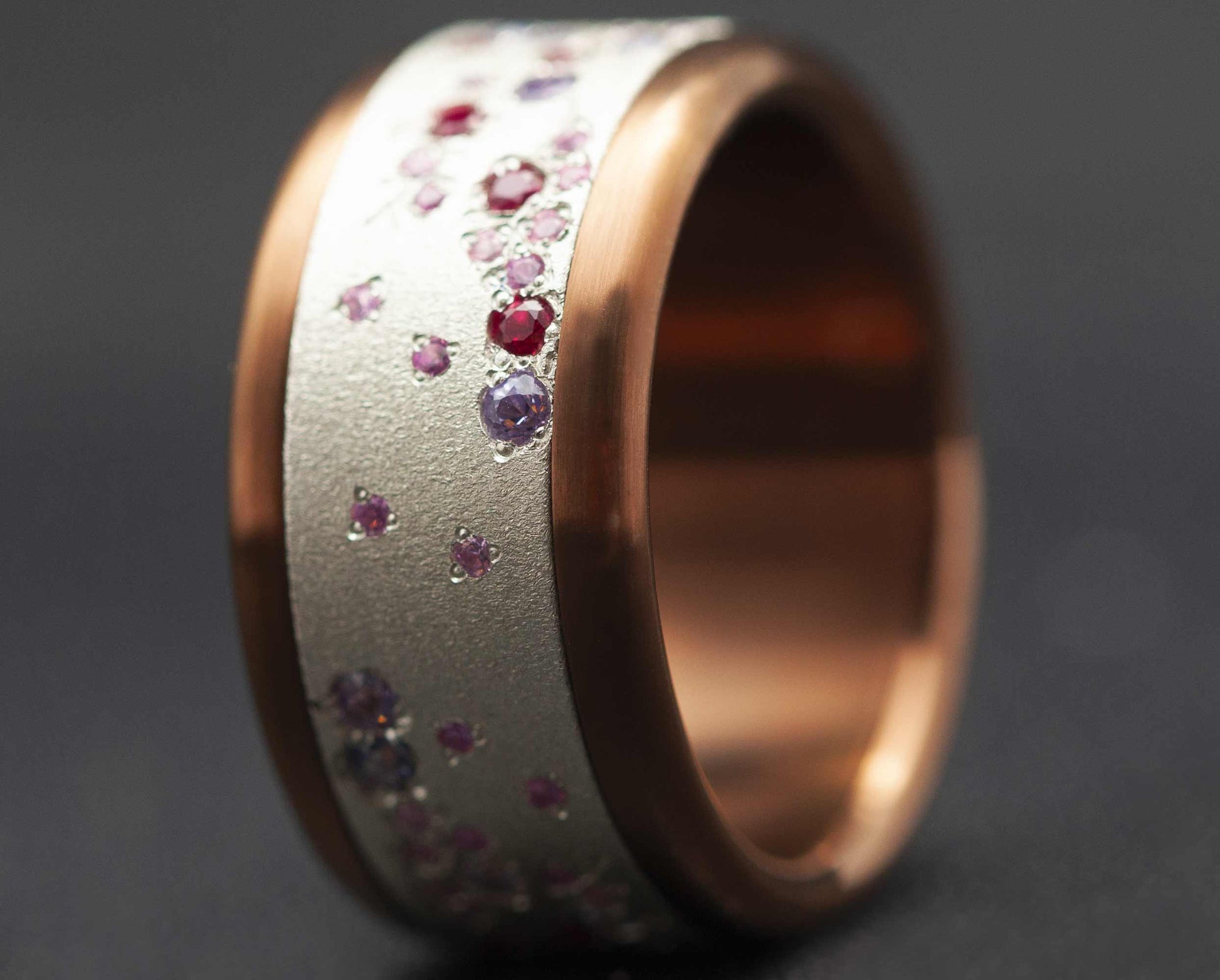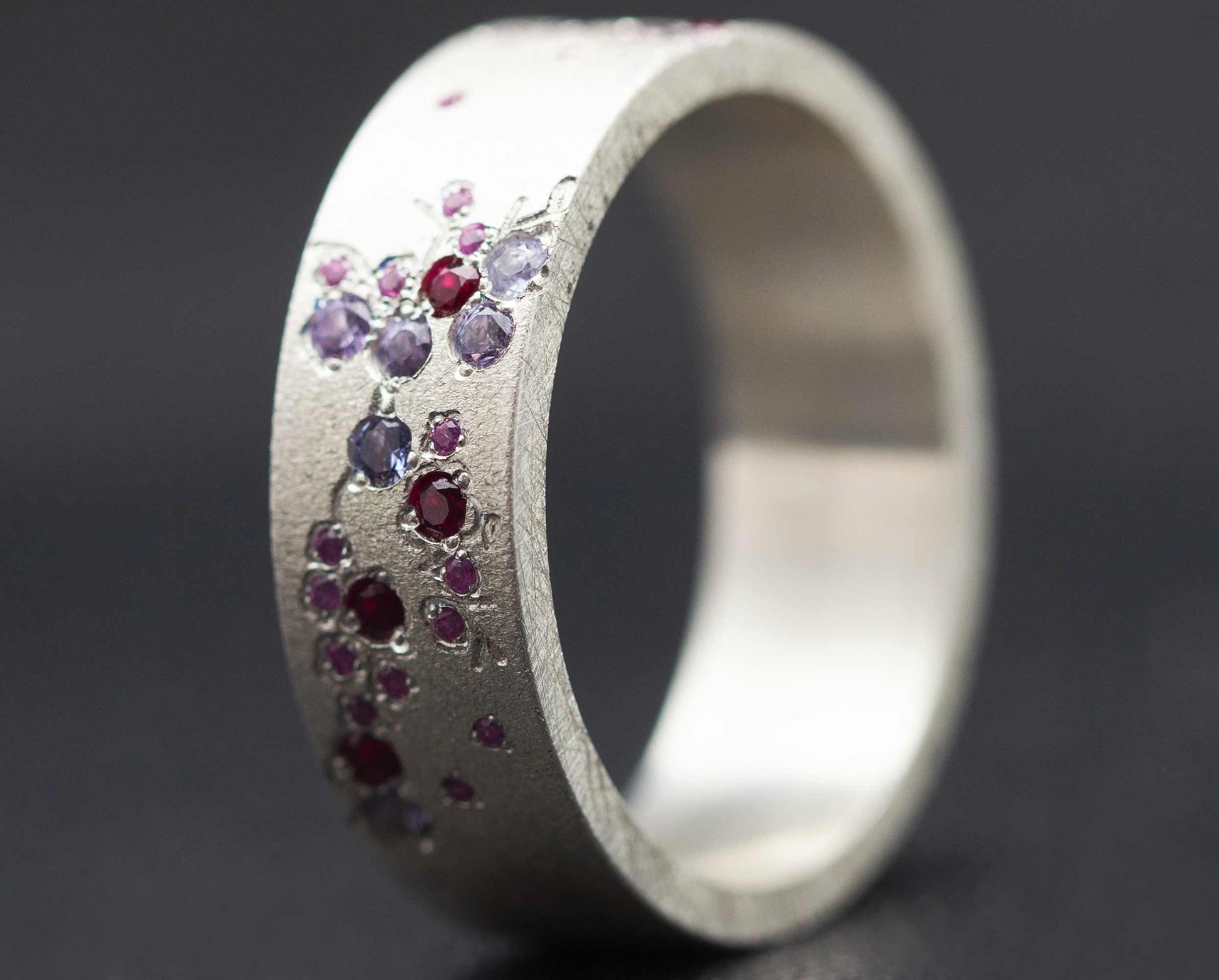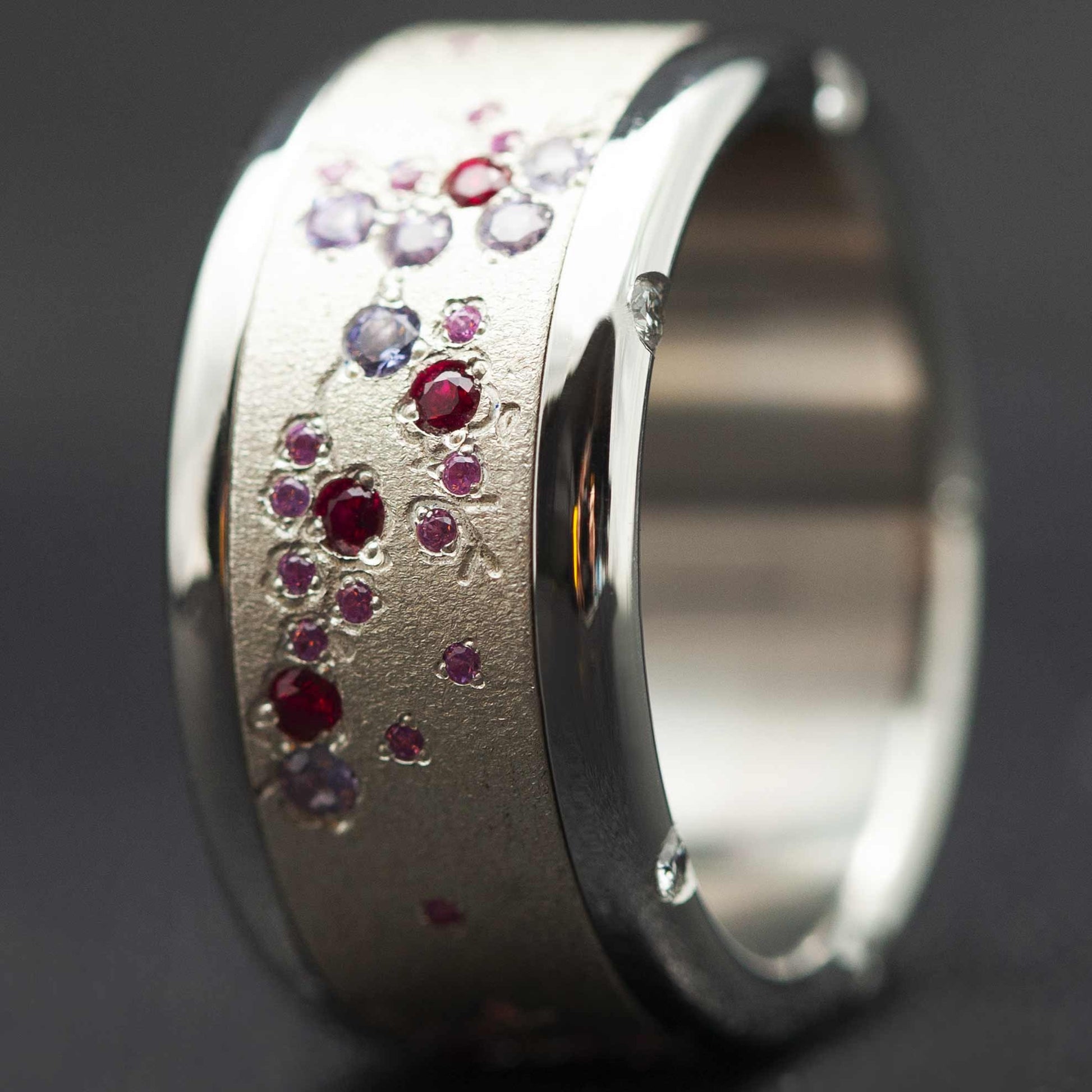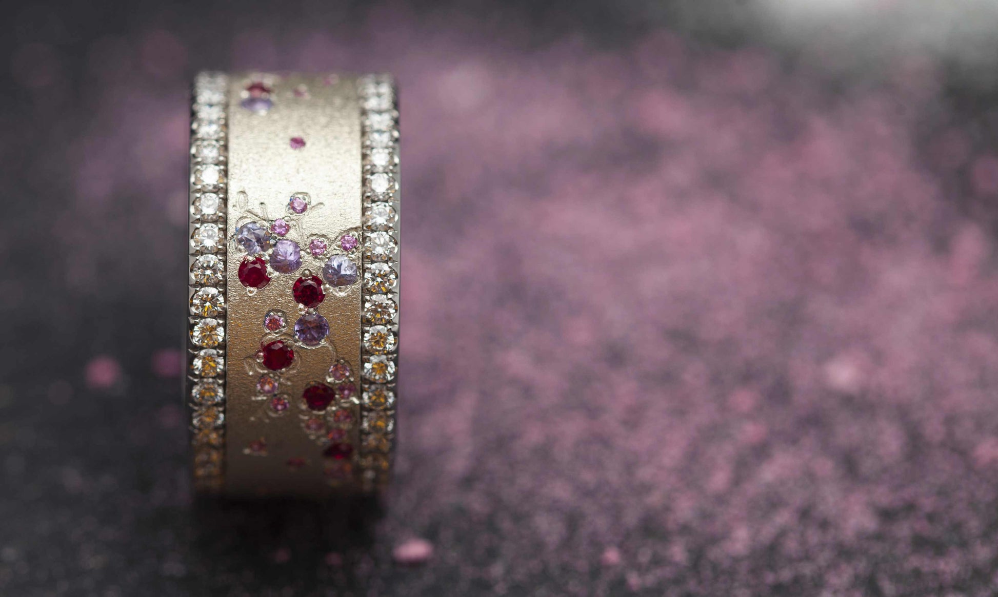 Cette pièce est sertie de 12 rubis 1.6mm, 18 saphirs mauves clairs 1.6mm ainsi que 46 saphirs mauves clairs 0.8mm.
