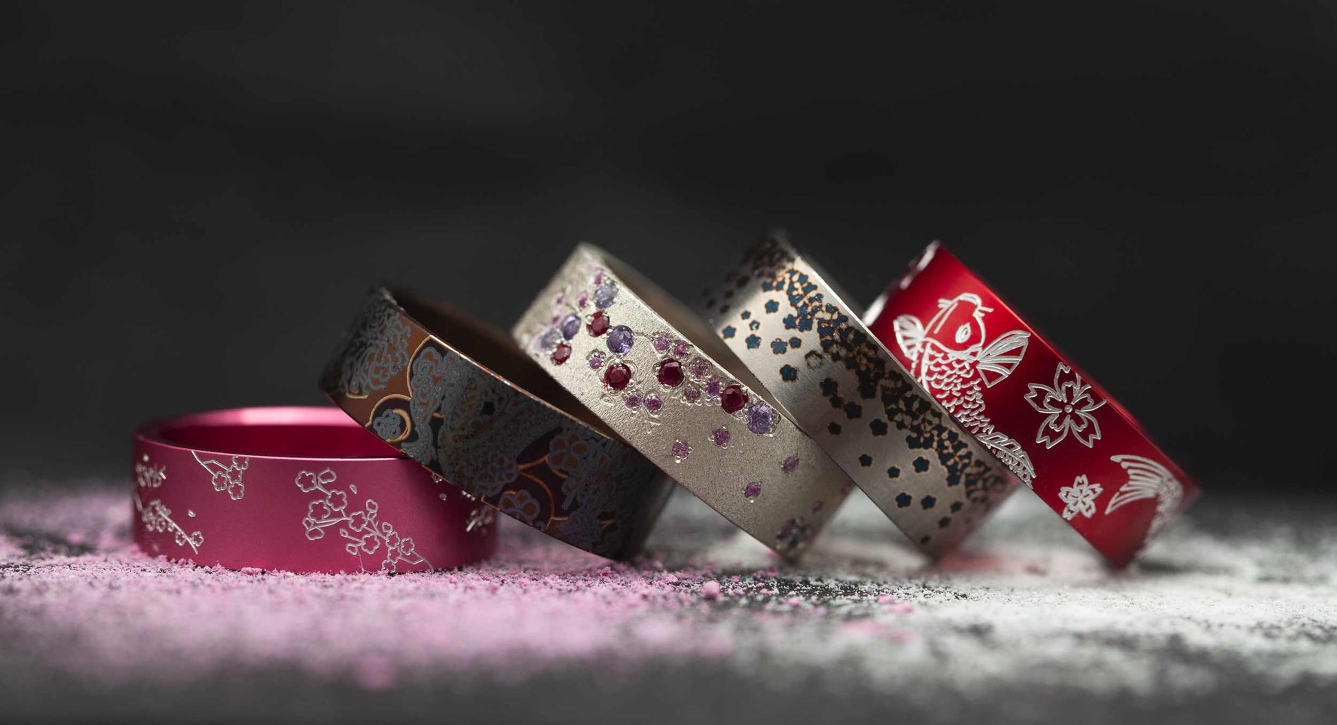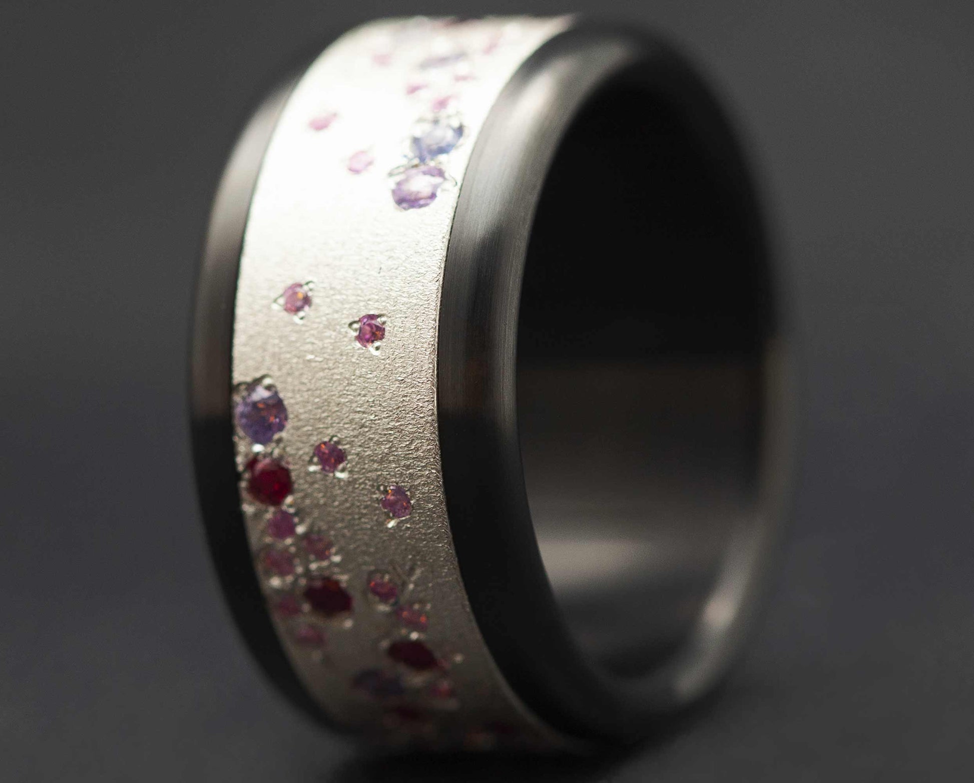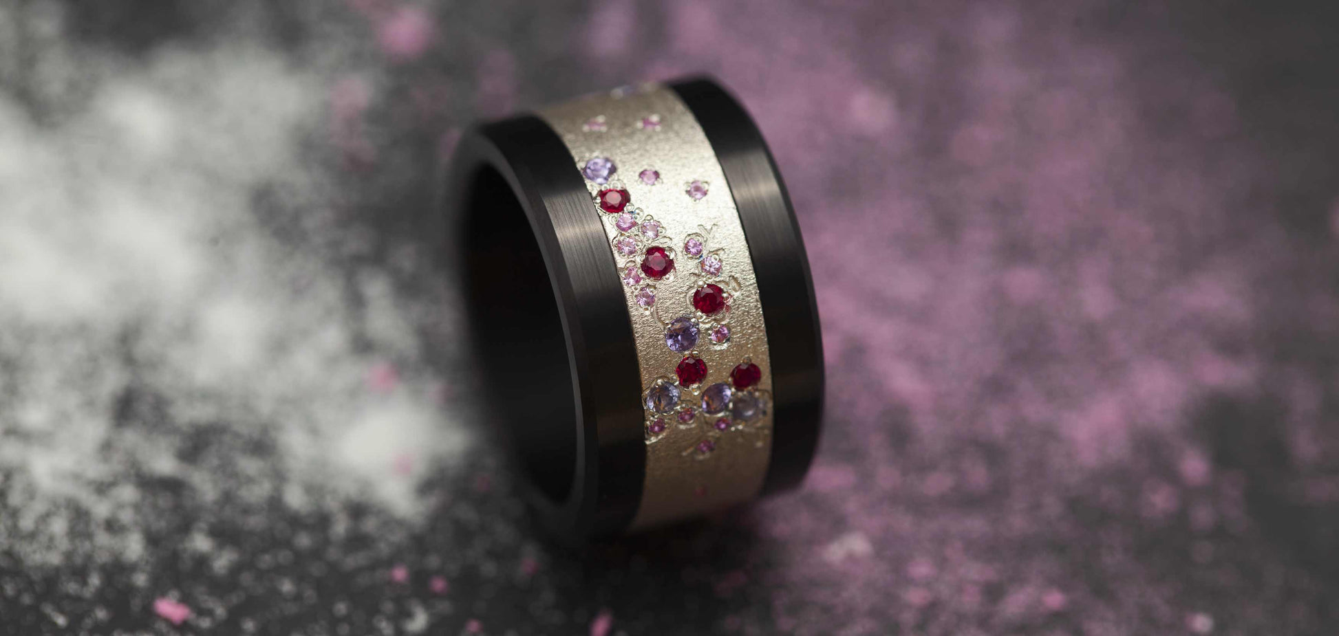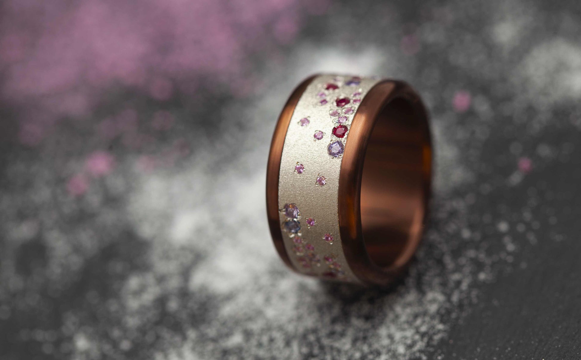 Cette pièce est sertie de 12 rubis 1.6mm, 18 saphirs mauves clairs 1.6mm ainsi que 46 saphirs mauves clairs 0.8mm.