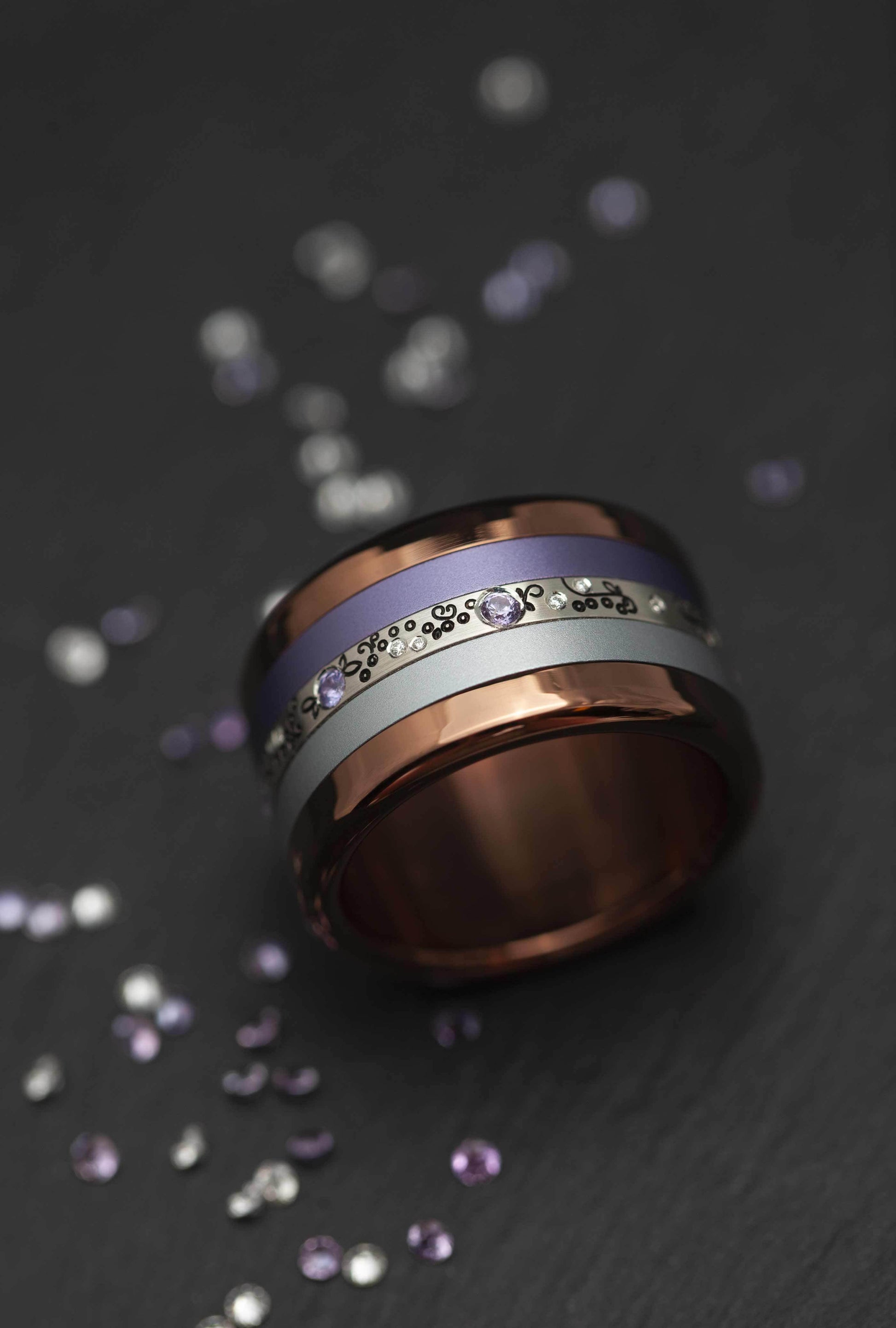 Cette pièce est sertie de 6 saphirs mauves clairs, de 10 diamants 0.8 mm et de 8 diamants 0.6mm.