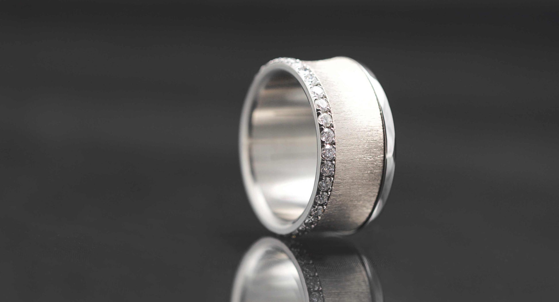 Zunächst einmal, Graugold, was ist das? Es handelt sich um eine Legierung zwischen Gold und Palladium. Palladium ist ein graues, fast weißes Material, das diesem neuen Stück seine besondere Farbe verleiht.